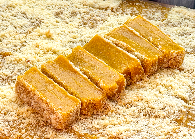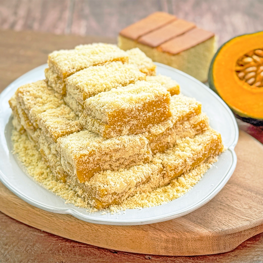 호박 인절미는 네모 반듯하게 잘린 모습으로 비닐포장돼있다.