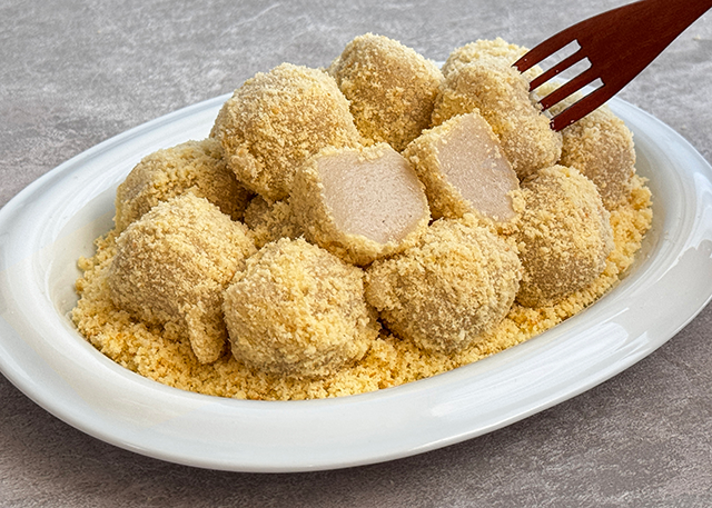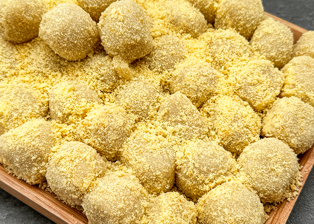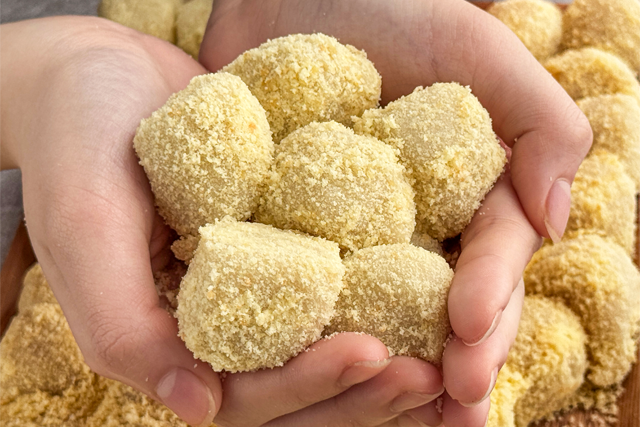 동그란 찹쌀떡에 카스테라 빵가루를 묻혀 만든 새알찰떡은 가볍게 먹기 좋다.