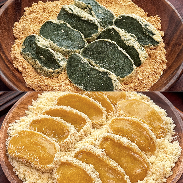 쑥 인절미에는 콩고물이, 단호박 인절미에는 카스테라 빵가루가 동봉되어 있다.