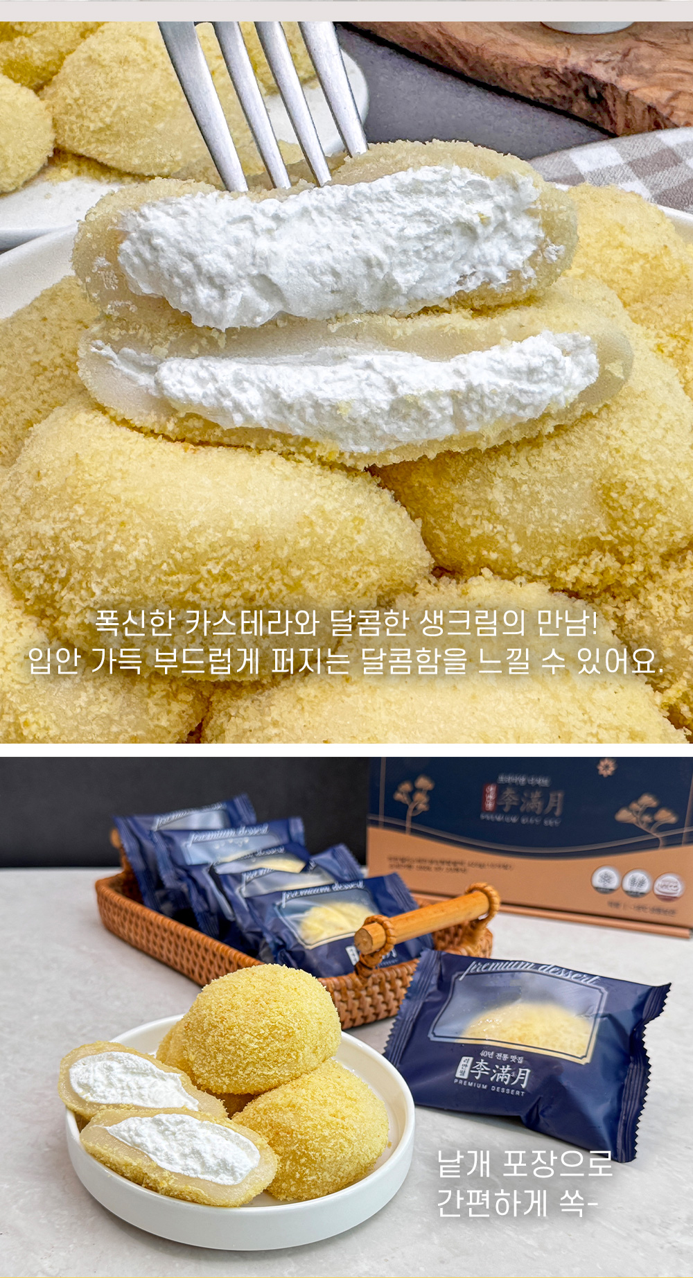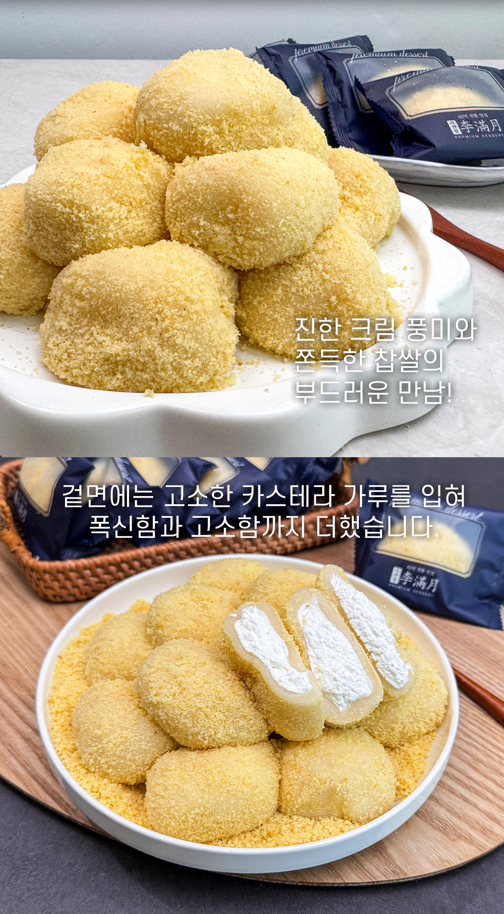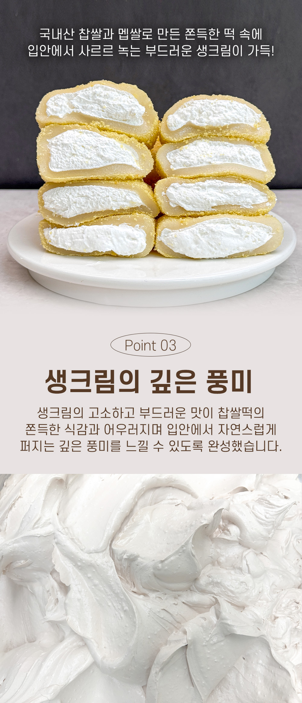 카스테라 생크림 찹쌀떡은 쫀득한 찹쌀떡 안에 하얀 생크림을 넣고 겉에는 카스테라 빵가루를 뿌렸다. 티라미수는 초코 생크림에 카카오 파우더를 뿌려 만든다.