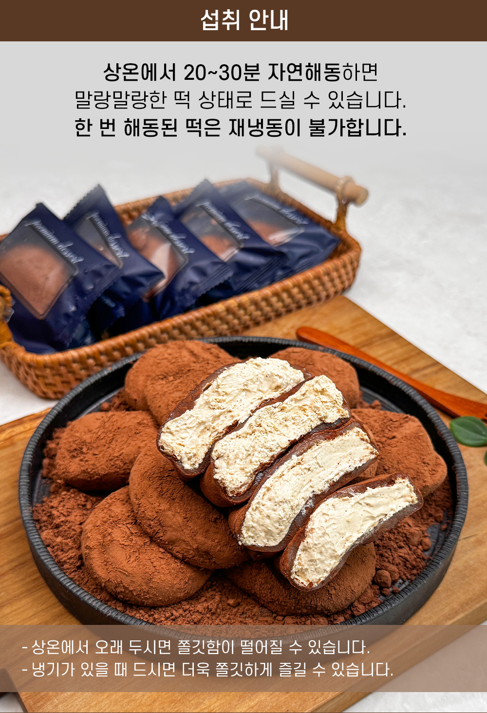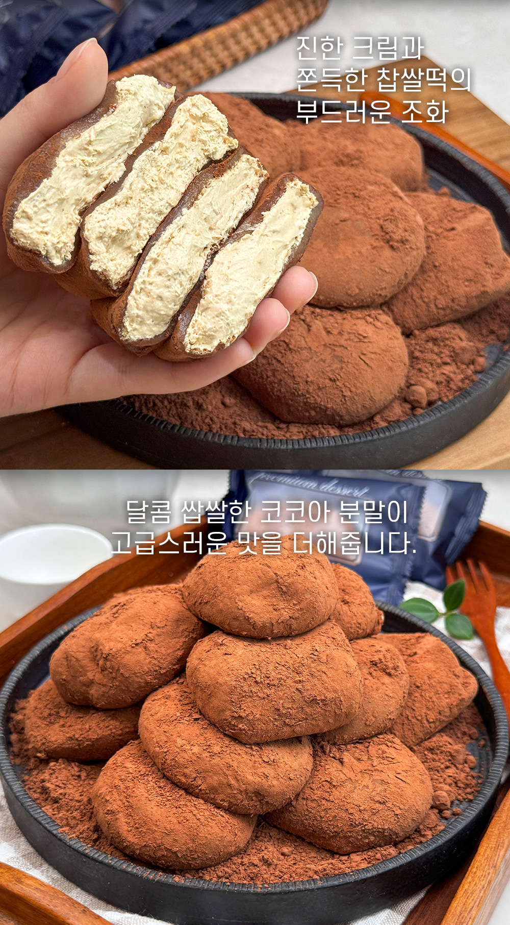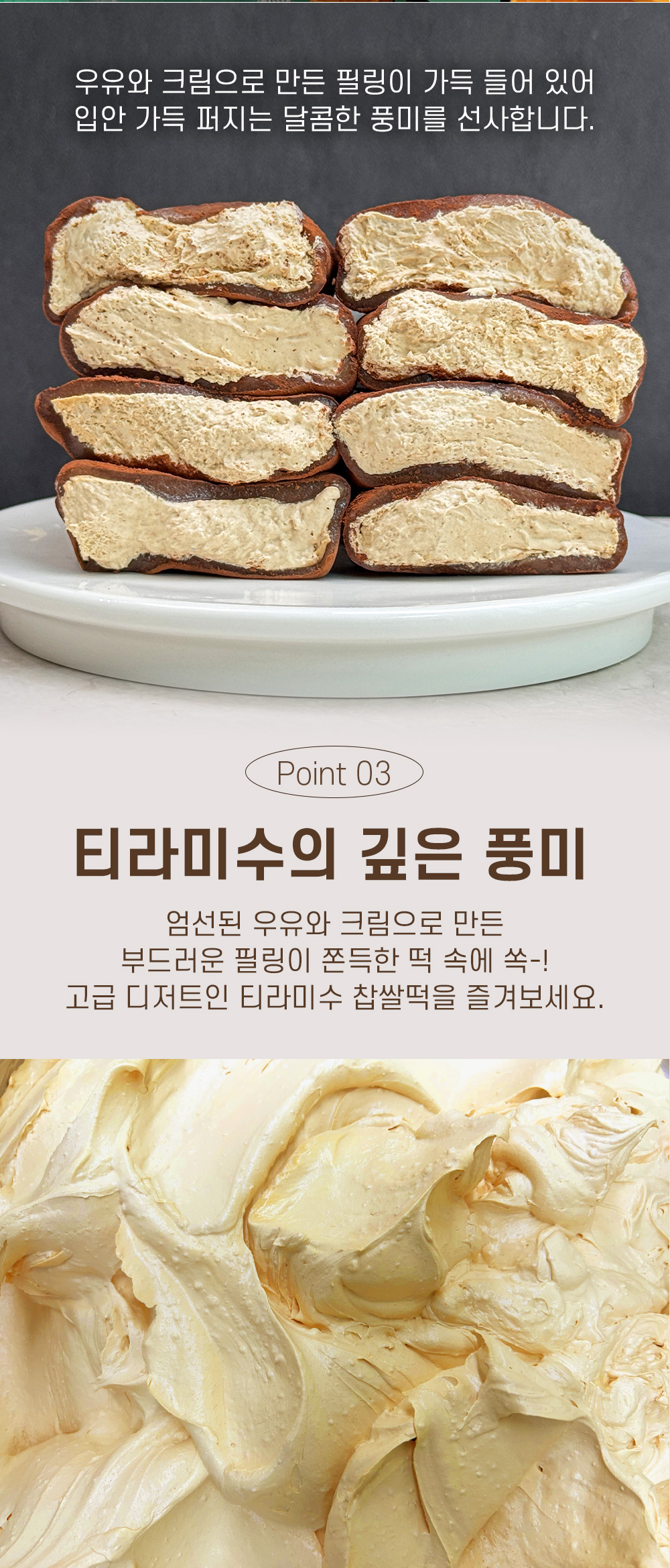 카스테라 생크림 찹쌀떡은 쫀득한 찹쌀떡 안에 하얀 생크림을 넣고 겉에는 카스테라 빵가루를 뿌렸다. 티라미수는 초코 생크림에 카카오 파우더를 뿌려 만든다.