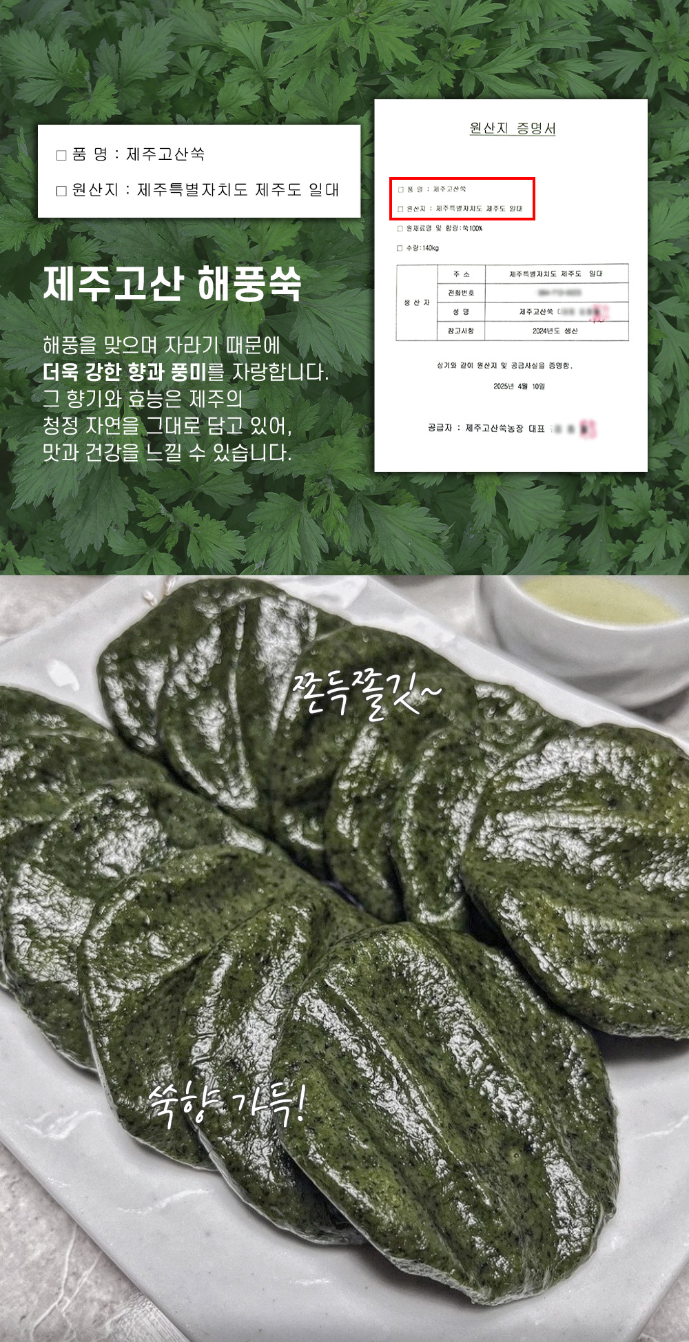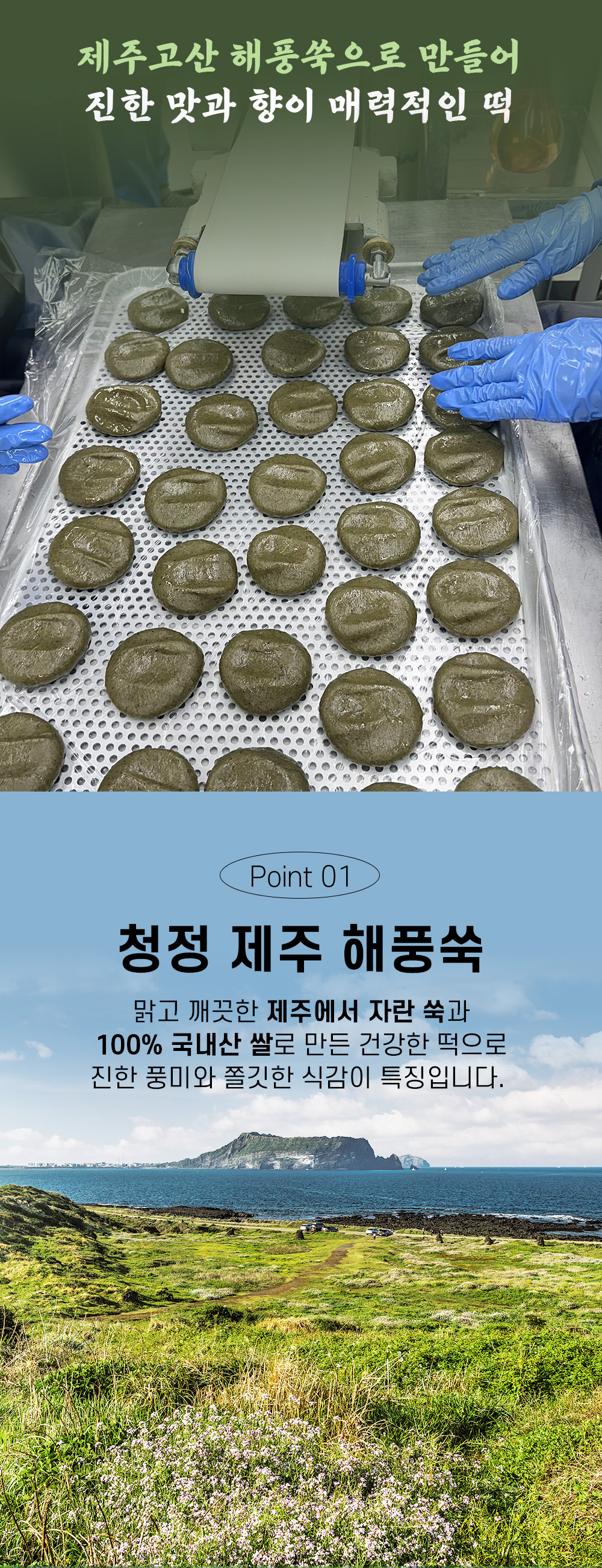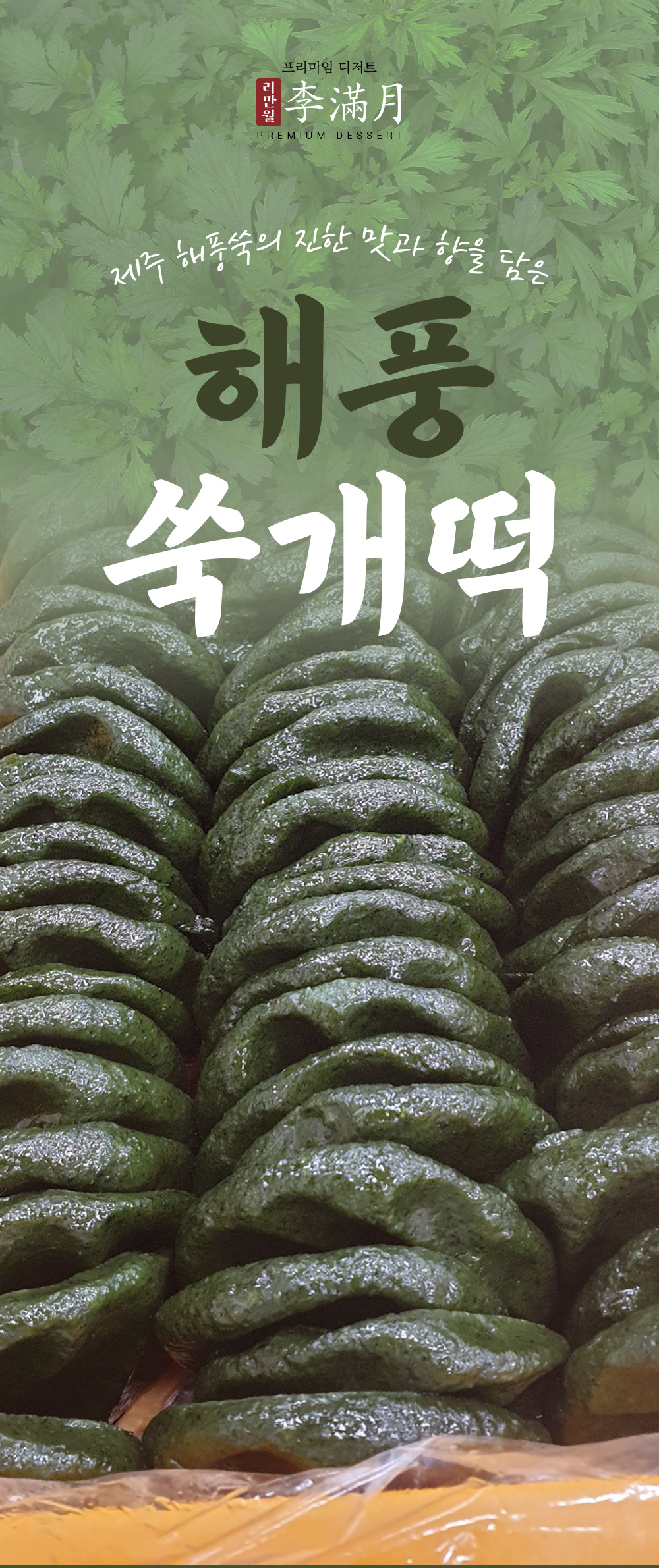 제주에서 해풍 맞고 자란 쑥으로 만들어 제주 해풍 쑥개떡이라 이름 지었다.