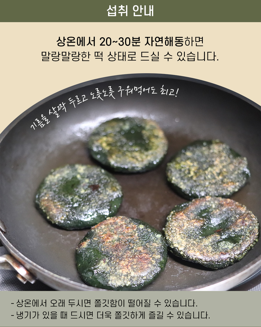 떡의 밀도가 높아 해동까지는 시간이 좀 걸리고 완전히 해동 후에 먹어야 특유의 쑥 향을 제대로 느낄 수 있어 먹기 전에 일찍 해동시키는 것을 추천드린다.