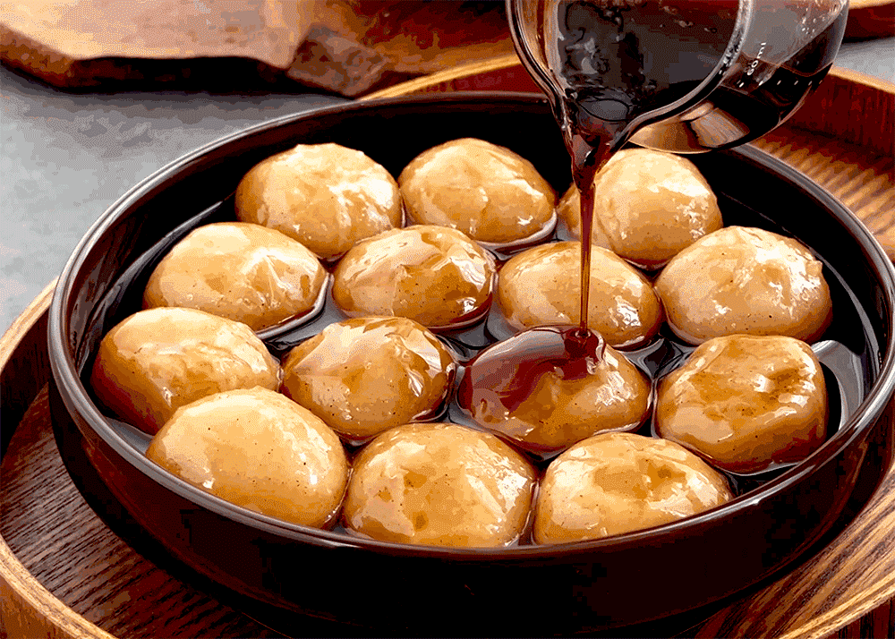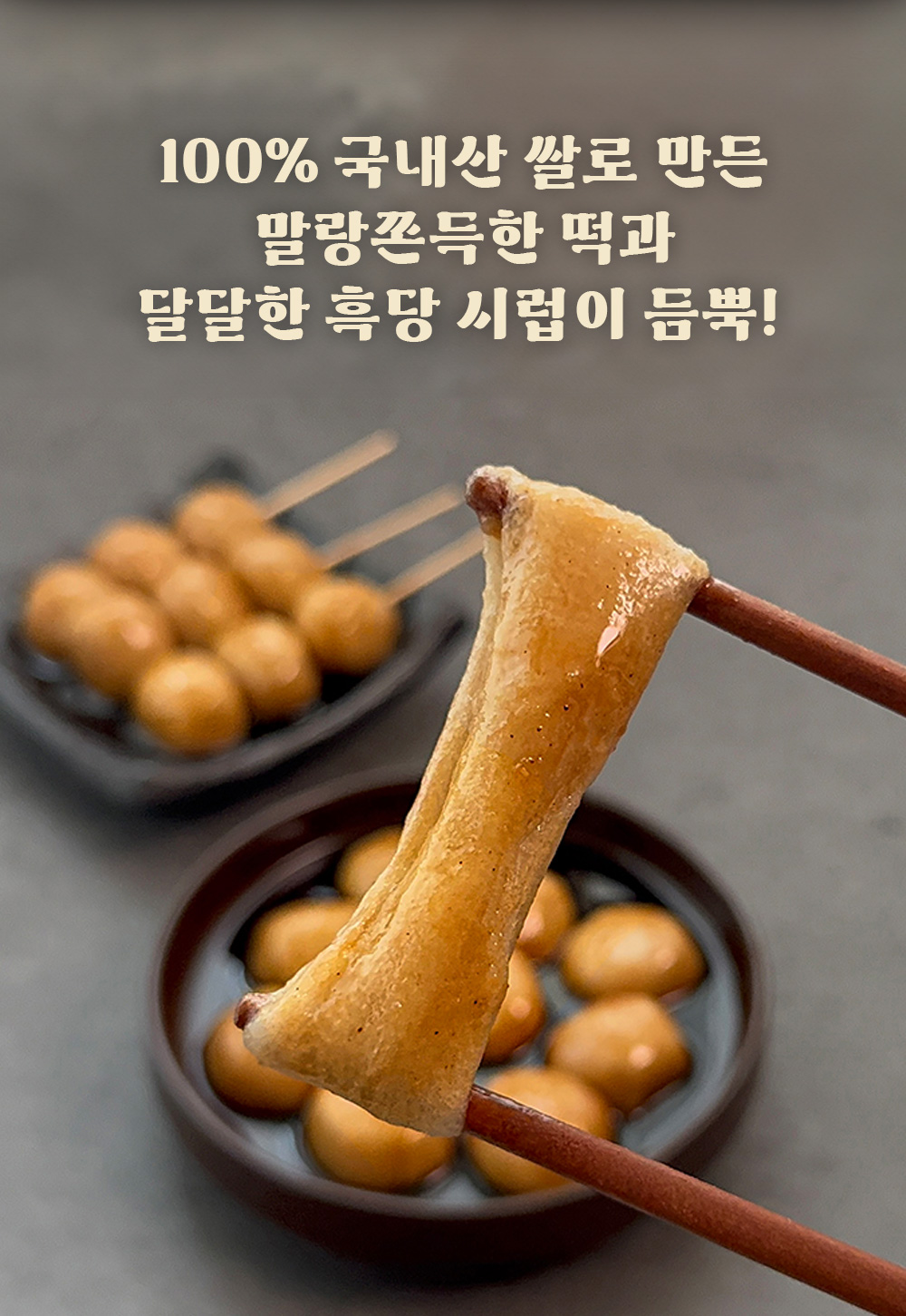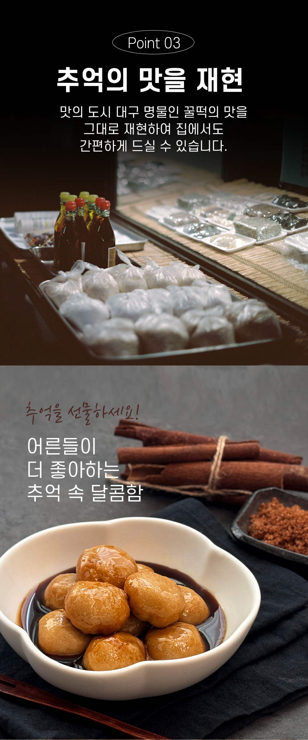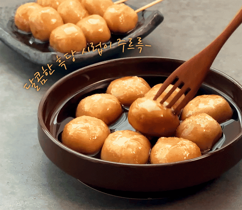 시럽은 흑설탕 베이스로 70~80년대에 대구에서 유래된 음식이라 대구 꿀떡이라는 이름이 붙었다.