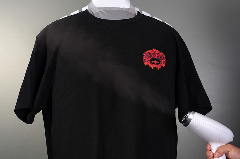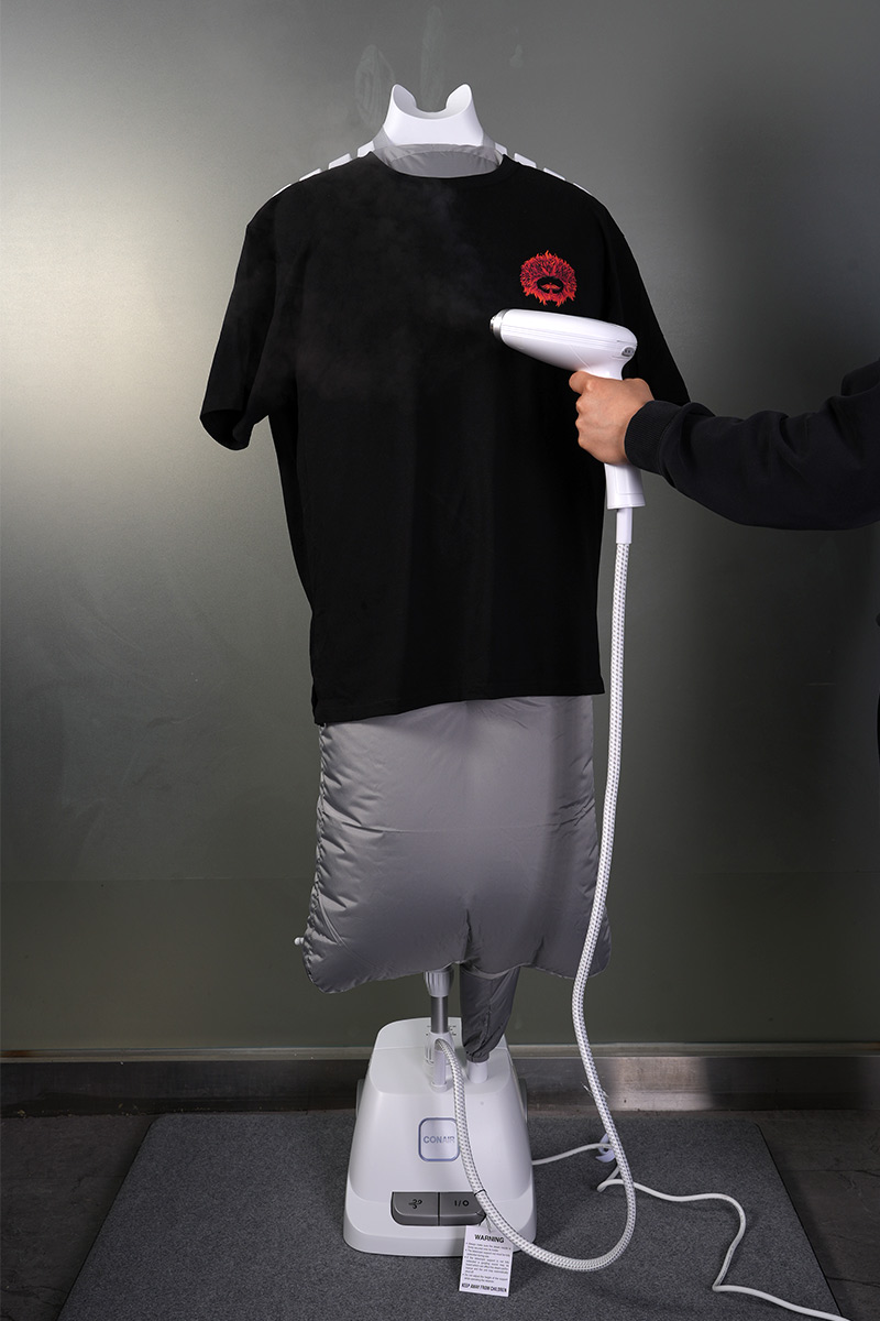 옷걸이에 걸린 상태 그대로, 다리미판을 꺼낼 필요도 없이, 전원을 켜고 몇 초만 기다린 뒤 그저 옷 위를 지나가듯 스팀을 쏘면 된다.
