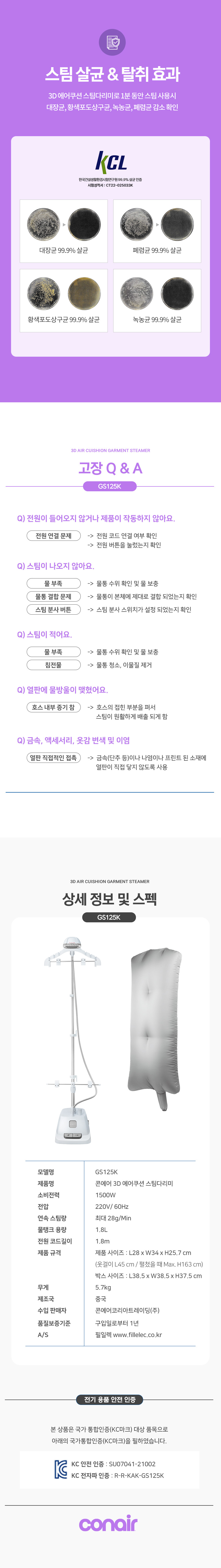 [GS125K] 콘에어 프리미엄 3D 에어쿠션 강력 스탠드스팀다리미 썸네일 9