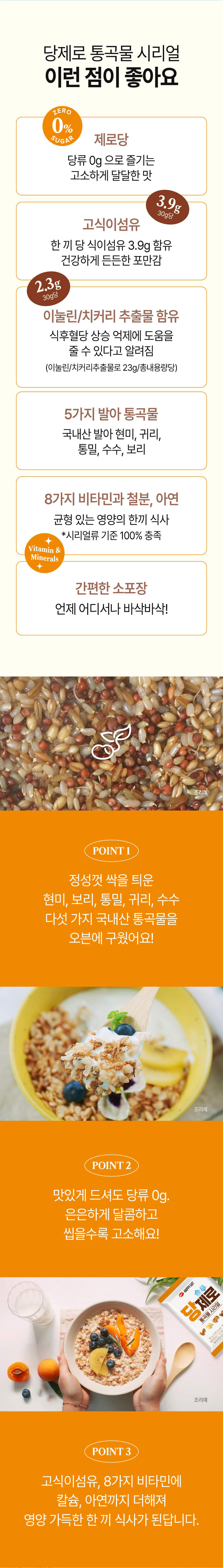 크기나 식감 등은 유기농 통곡물 시리얼과 비슷해 당제로 시리얼 역시 부담 없이 누구나 먹을 수 있는 제품이다.
